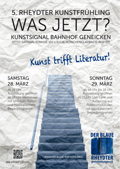 allerdings zu Gunsten der Künstlergruppe amtlich entschieden wurden. Anfang der 1900er Jahre, aber nur kurze Zeit bis zum Beginn des ersten Weltkriegs, bestanden „Die blauen Reiter“ und hatten mit Wassily Kandinsky, Franz Marc, August Macke, Gabriele Münter, Alexej Jawlensky, Paul Klee und anderen Künstlern eine neue Ära der Kunst begründet: den Expressionismus – wild, frei, gegen den Wind. „Freiheit“ lautet nun auch das Motto des Mönchengladbacher Künstlervereins für die diesjährigen Rheydter Kunsttage vom 6. bis 8. September 2024. Durch die Gemeinnützigkeit können jetzt Spenden entgegen genommen und mit einer amtlichen Spendenquittung bestätigt werden. Darüber hinaus haben "Die Blauen Rheydter" eine Fördermitgliedschaft ab 60 Euro Jahresbeitrag eingerichtet, die mit einem Kunstwerk als jährlichem Dankeschön belohnt werden wird. Wollte die Künstlergemeinschaft ursprünglich den Stadtteil Rheydt mehr in den Fokus der Mönchengladbacher Kunstszene rücken, hat sich der Radius der Aktivitäten – auch durch international tätige Mitglieder – mittlerweile weltweit ausgeweitet. So kam ein Mitglied vor wenigen Tagen aus Neuseeland zurück, wo es eine großformatige Kunstinstallation in der Kathedrale von Auckland zur Umweltproblematik - Thema Kunst als Umwelterhalt - präsentieren konnte. Andere Mitglieder der Blauen Rheydter sind jedes Jahr gefragte Teilnehmer, nicht nur in Europa, sondern auch in den Vereinigten Staaten oder in den arabischen Emiraten bei Street-Art-Festivals. Seit der Verein beim Amtsgericht eingetragen ist, sind drei ebenfalls professionelle Künstlerinnen und Künstler aus Syrien, der Ukraine und Deutschland dem Verein beigetreten. Zur Zeit sind 14 Mitglieder aktiv. Die jährlichen Veranstaltungen – Rheydter Kunstfrühling und Rheydter Kunsttage im Herbst - werden mittlerweile in Kooperation mit dem Kunstsignal e.V. im Bahnhof Geneicken durchgeführt. „Die Blauen Rheydter“ sind seit Jahren im Gespräch mit anderen Künstlervereinigungen und Städten vor allem am Niederrhein und beabsichtigen, sich in naher Zukunft weiteren Kooperationen und Events anzuschließen. 3. Rheydter Kunstfrühling 27.-28. April 2024 Thema: Aus!?Wege |